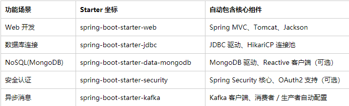 Spring Boot 最显著的生产力提升工具之一是 Starter 依赖体系,通过命名规范清晰的 “一站式” 依赖包,开发者无需手动搜索和匹配兼容版本,框架自动处理传递依赖冲突。